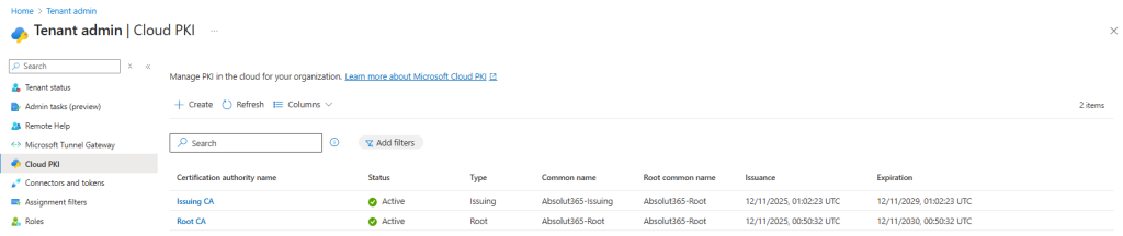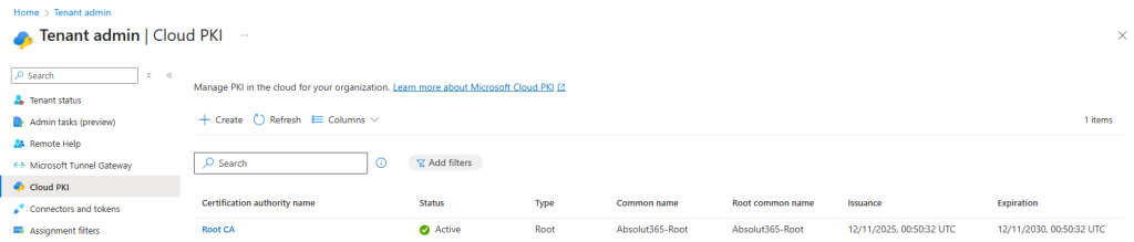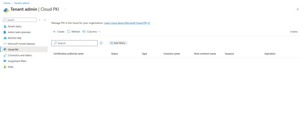 Abre la consola de gestión de Intune y navega a Administración de Inquilinos > PKI en la nube.