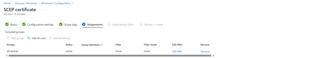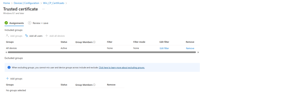 Como necesitamos que los nuevos dispositivos reciban el certificado de confianza lo antes posible durante el registro o aprovisionamiento, usar Todos los dispositivos + filtro es el método más eficiente en este escenario.