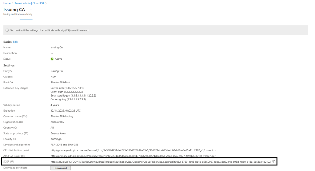 Podés encontrar este valor ingresando a las propiedades de la CA emisora desde la consola de Cloud PKI.