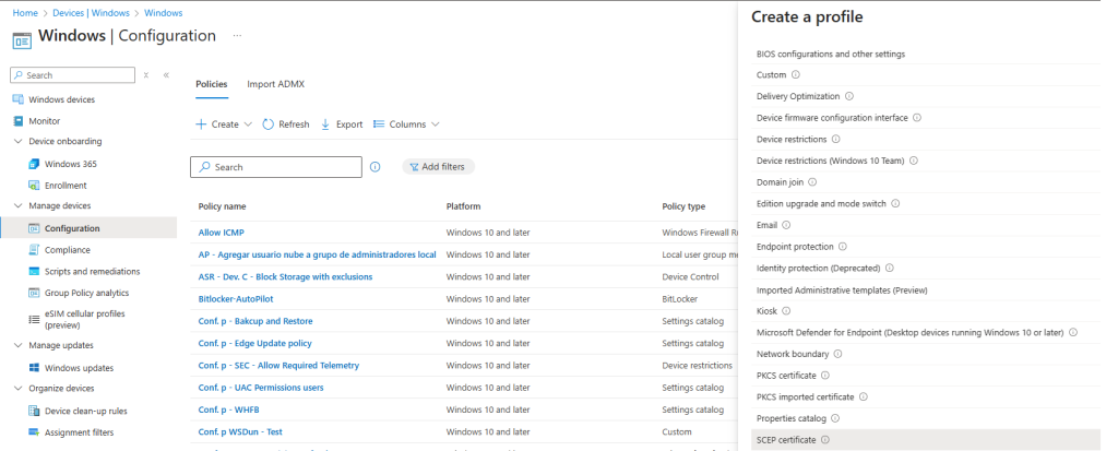 Para eso, vamos a crear un perfil SCEP por cada plataforma de sistema operativo donde necesitemos emitir certificados.