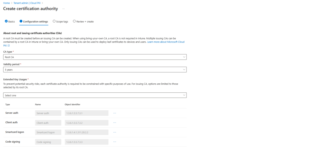 Tené en cuenta que solo aparecen los EKU habilitados en la CA raíz; no podés agregar otros nuevos en esta etapa.