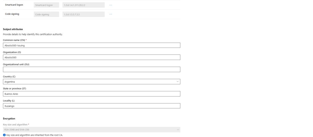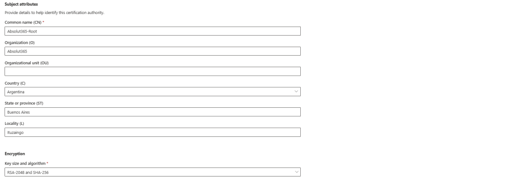 El tamaño de la clave y el algoritmo se heredan automáticamente de la CA raíz, así que no necesitás seleccionar nada en este paso.